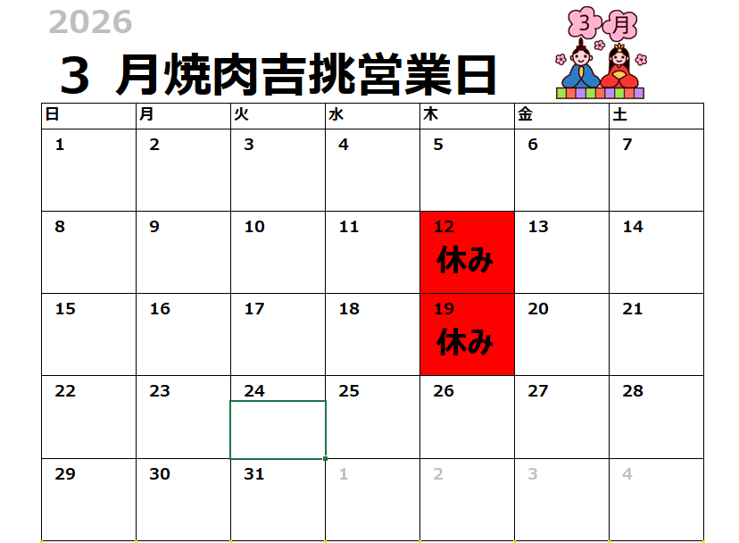 3月の営業カレンダーです。