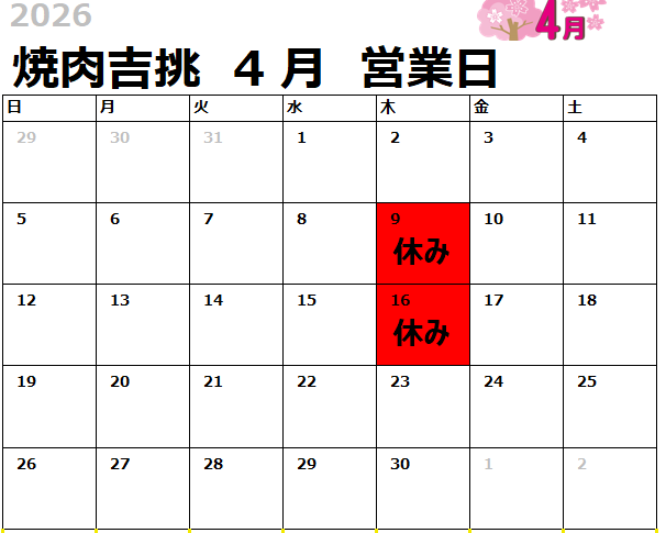 4月の営業カレンダーです。